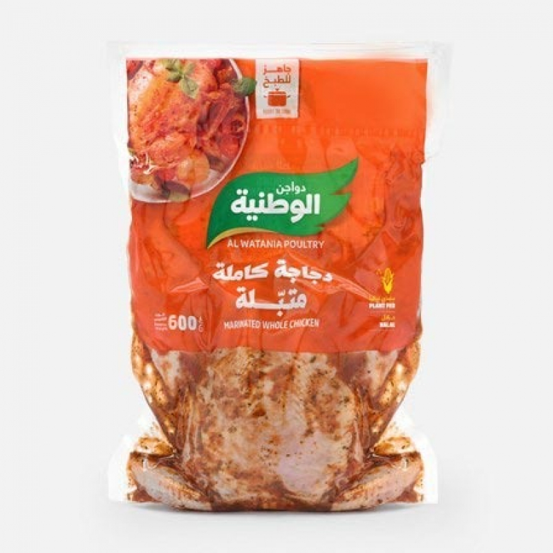 A whole, fresh, marinated chicken (600 grams) made from naturally fed chicken during all stages of rearing at Al Watania Poultry Farms until slaughter. Slaughtered according to Islamic law, it is highly nutritious and air-chilled, preserving its delicious taste and nutritional value. It is mechanically cleaned, prepared, and packaged according to the latest international standards.