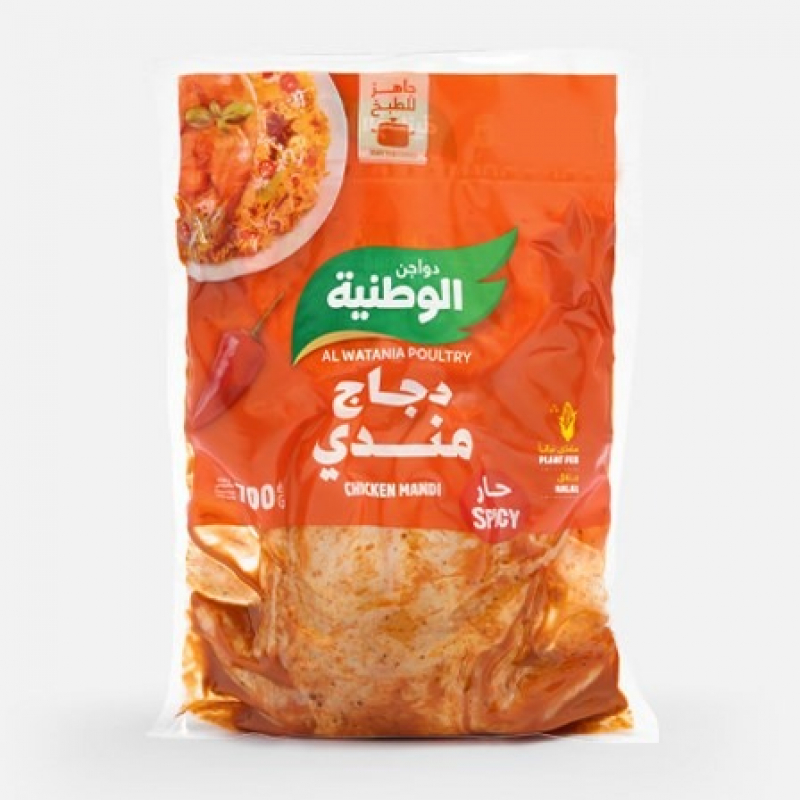 A whole fresh chicken marinated in a spicy Mandi flavor, 700 grams of chicken naturally fed throughout all stages of its rearing at Al Watania Poultry Farms, right up to slaughter. Slaughtered according to Islamic law, it is highly nutritious and air-chilled, preserving its delicious taste and nutritional value. It is mechanically cleaned, prepared, and packaged according to the latest international standards.