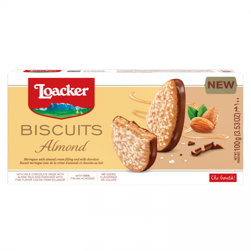 Loacker Nut Selection Almond, pretty almond-shaped biscuits that, both inside and out, bring out the best of every little detail, from the delicious almond cream filling between two fragrant meringue biscuits to the scented flakes that adorn the outside. The almonds used in our cream are 100% Italian. It has never been so easy to be seduced!