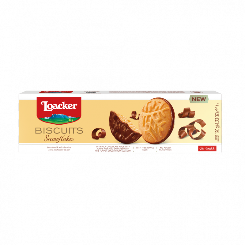 Loacker Snowflakes is a soft and crispy biscuit. Its base is covered in a light layer of refined dark milk chocolate. A simple yet refined treat, its name becomes obvious upon seeing a snowflake printed on its shortcrust side: a feast for the eyes and palate.