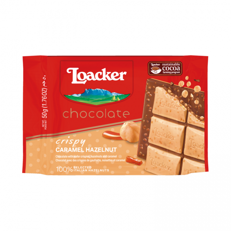 The stunning combination of flavors in Loacker Crispy Caramel Hazelnut will make you feel you are in paradise. On one side, a delicate surface of white chocolate, enriched with crunchy caramel drops and pieces of Italian hazelnuts, whose quality is guaranteed by our "Italian Hazelnut Orchards” project. On the other, an irresistible surface of milk chocolate, with a generous shower of wafer crispies.