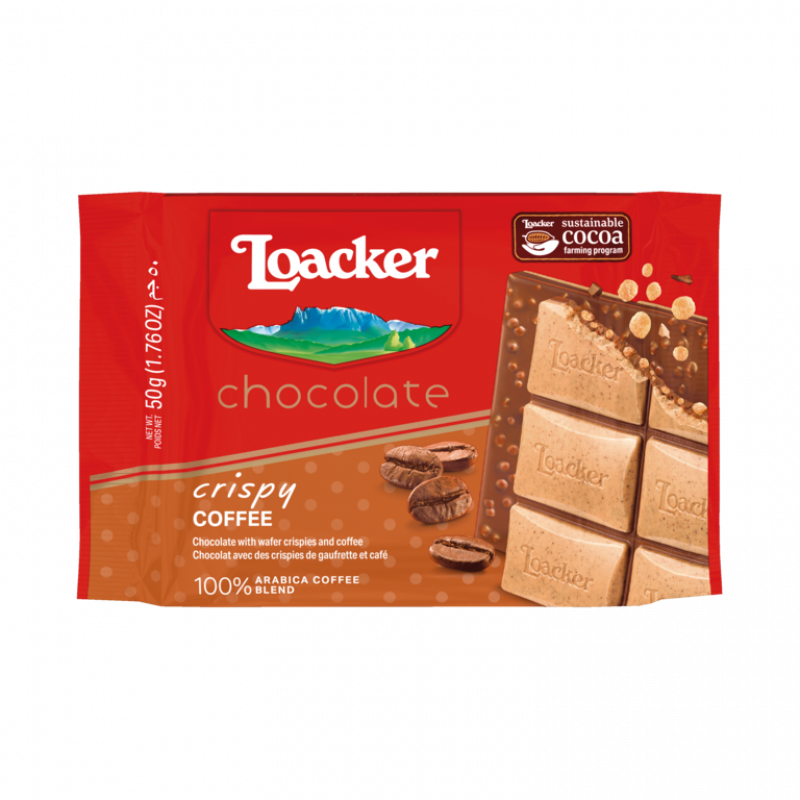 Wherever you are, whatever the time, Loacker Crispy Coffee is the chocolate bar that will rekindle your pleasure and delight the senses. Try the unique combination of delicate white chocolate, with the full, delicious aroma of freshly ground coffee, and milk chocolate (38% cacao) enriched with a shower of wafer crispies.