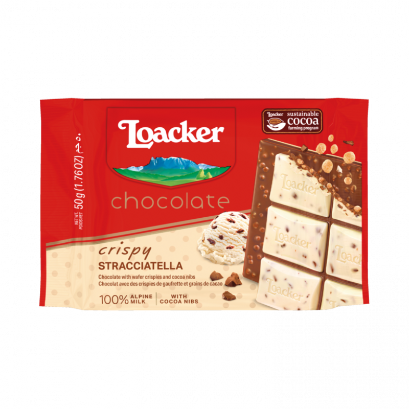 Wherever you are, whatever the time, Loacker Crispy Stracciatella is a heavenly treat, inspired by one of the Italians’ best-loved flavors. Its wonderful contrasts will amaze you every time. On the one hand you’ll be enchanted by the delicate, pervasive taste of white chocolate, with the crunchiness of its intense cacao nibs. On the other, you’ll enjoy the subtleties of the exquisite milk chocolate, enriched with a shower of little wafer crispies.